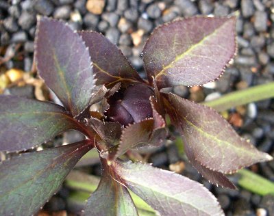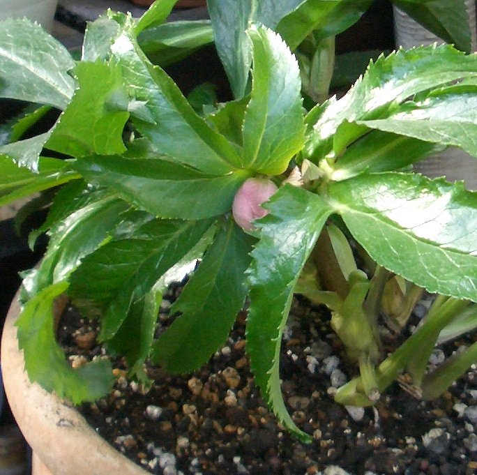 遅咲きのクリスマスローズ ブラック系の蕾が覗いてきました。