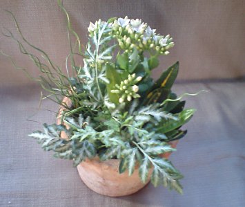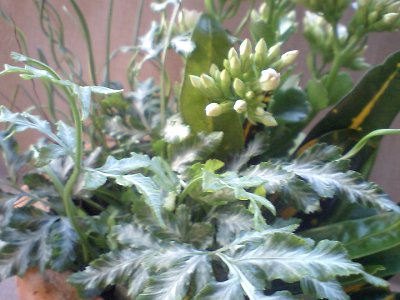 乾き好きのカランコエと湿り気好きのプテリス、ラセンイ、それからクロトンの寄せ植え。