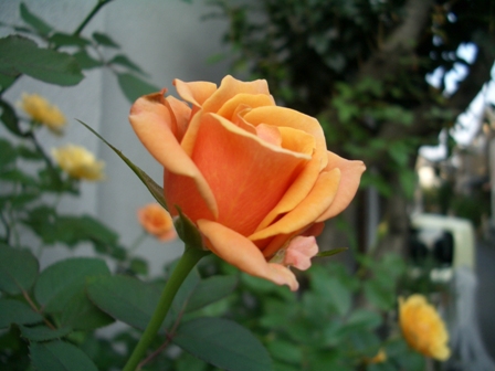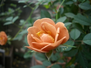 アプリコット系の淡い色が多い我が庭では、このバラが咲くと雰囲気がパッと変わります。